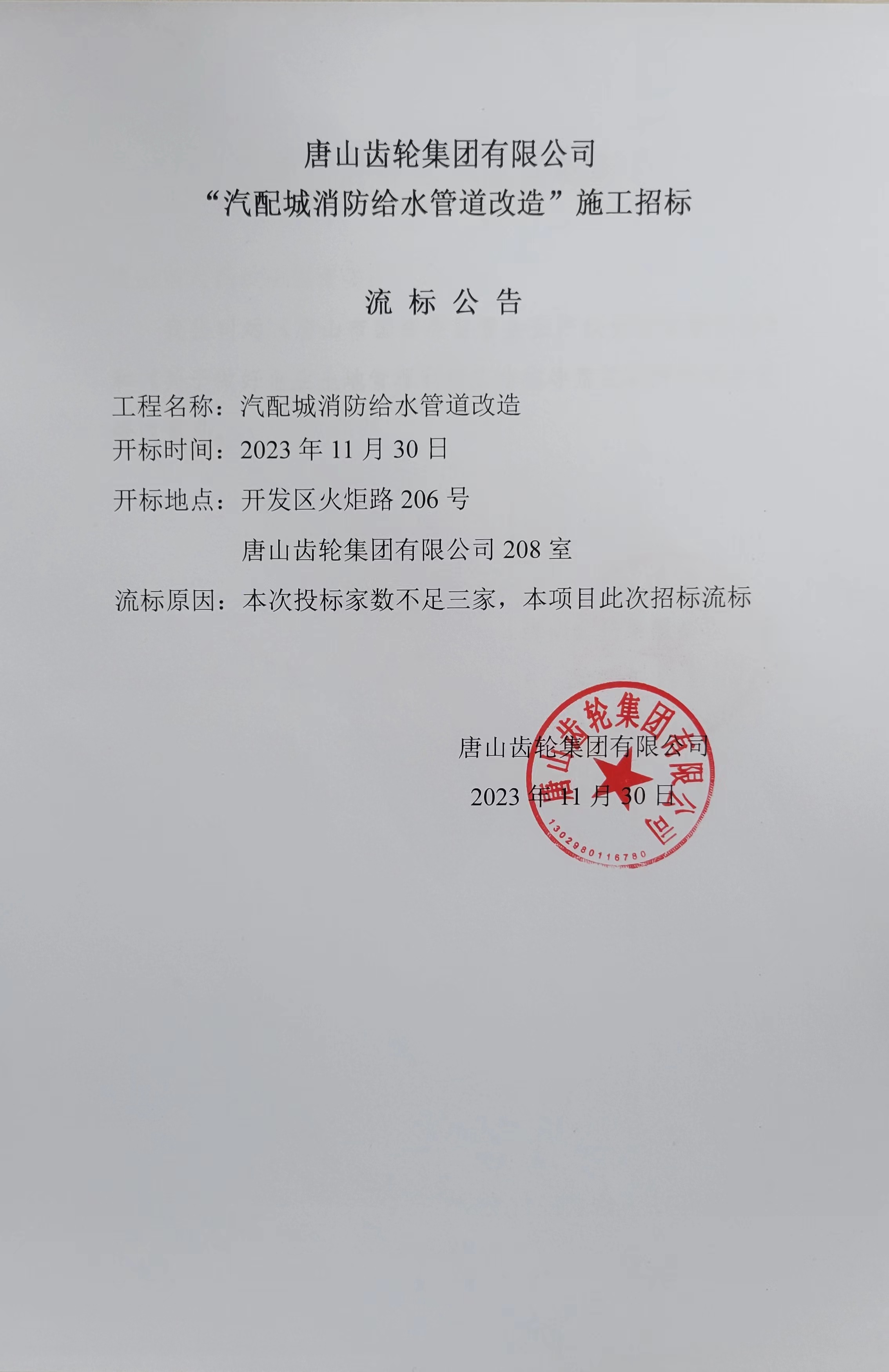 江南官方网页版“汽配城消防给水管道改造”施工招标流标公告